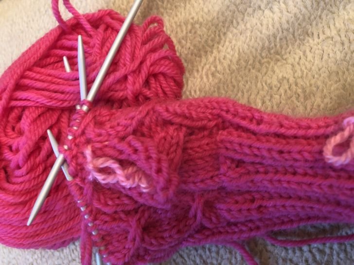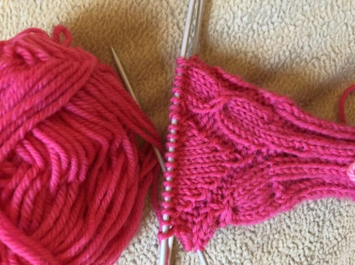 Следующие 2 ряда провязать все петли лицевые. Разделить вязание на 2 части по 21 петли на 2 спицы, чулочное вязание. Убавления делать на 1 спице вначале ряда после 2-х лицевых (убавление с наклоном влево -1 снять , не провязывая , 1 провязать лицевой ,потом набросить петлю на непровязанную и протянуть) и в конце перед 2-мя лицевыми (с наклоном вправо, пока не останется на каждой спице по 7 петель ( в этом ряду посередине убавить по 3 петли – 1 снять . Не провязывая, 2 петли провязать вместе лицевой и протянуть через 2 непровязанные). На спицах теперь осталось по 5 петель. Нить поочередно протянуть через 5 петель , стянуть , закрепить.