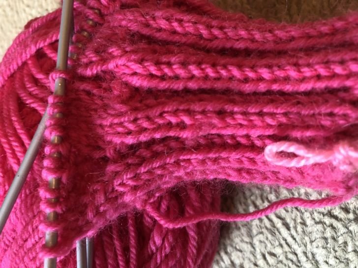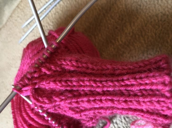 Набрать 36петель круговыми спицами№3,5 ,,Волшебным способом, набором резинки 2х2 (есть видео в интернете, можно набрать петли обычным способом ) Набросить нить на одну из спиц, дальше поочередно обвести нитью то нижнюю , то верхнюю спицу .Нижнюю спицу обвести вокруг верхней нити , верхнюю спицу вокруг нижней спицы. Набрать на каждую спицу по 18 петель. Провязать по кругу лицевыми петлями 2 стороны. Сложить вязание сгибом вниз, чулочной спицей №2.5 поочередно вязать резинку 2х2, с ближней спицы вязать 2 лицевые, с дальней спицы 2 изнаночные.