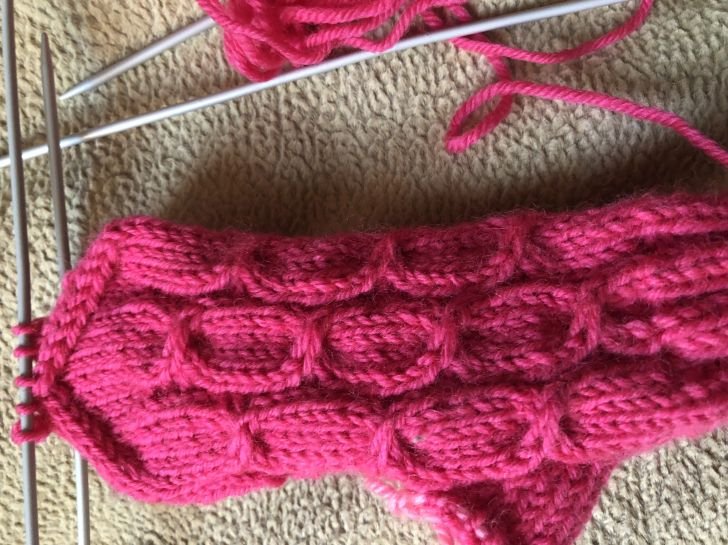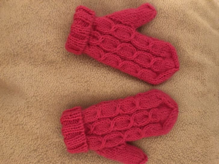 Так связана правая варежка, вязать левую варежку также, только пальчик с левой стороны на 1-ой спице . Уровень вязания средний. Время работы 6 часов. Рисунок – переплетение состоит из 5 петель-делать с помощью двух дополнительных спиц. – сначала снять 1 петлю на дополнительную спицу перед работой, затем снять 3 петли на вторую дополнительную спицу за работой, далее вязать рабочей спицей 5-ю петлю лицевой ,затем вязать снятую 1 лицевую петлю перед работой.