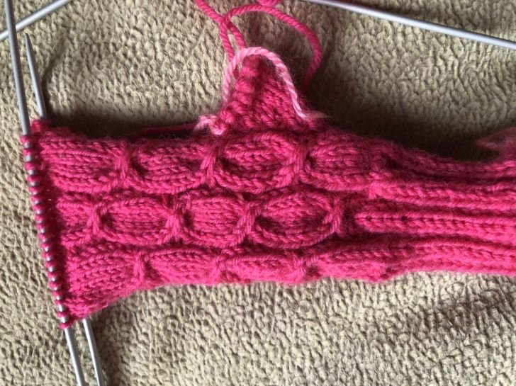 После снять на контрастную нить или булавку 13 петель. Продолжать вязание по рисунку , там где 4 изнаночные петли , сделать убавление из 2 петель провязать вместе изнаночной 2 раза . Снова на спицах стало 42 петли. Пальчик связать отдельно, набрав еще по краю дополнительно 2 петли. Всего пальчик состоит из 15 петель , провязать 10 рядов, убавив по краям с .2-х сторон . Вернемся к вязанию к 42 петлям.