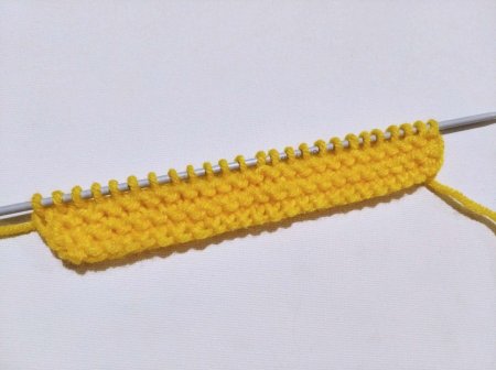 Набираем на спицы 25 петель. И провязываем платочной вязкой 5 рядов. В каждом ряду мы все петельки просто вяжем лицевыми.