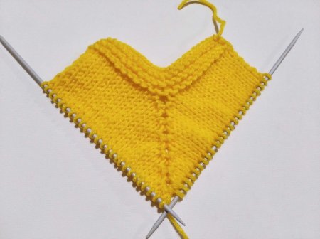 В новом лицевом ряду вяжем не 14, а уже 16 лицевых и из следующей петли вывязываем 5 новых петель, заканчиваем ряд 16 лицевыми петлями. И так далее, пока не наберется 49 петель.