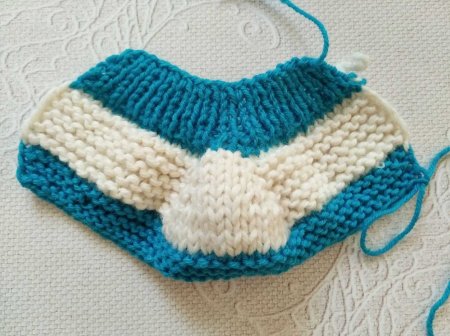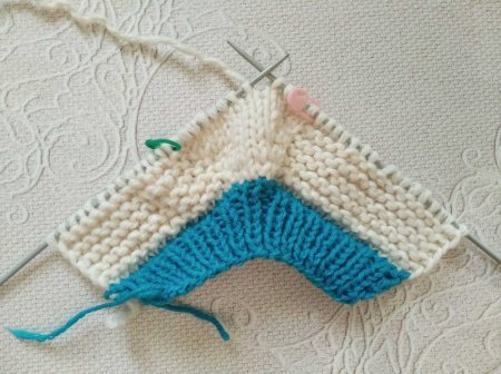 Теперь будем повторять эти 2 ряда. То есть в лицевом ряду все петли будут вязаться лицевыми, но также в нем после первого маркерочка делается прибавка и перед вторым маркером также выполняется прибавка.