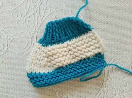 В этом МК пинетки вяжутся в двух цветах. Манжета и подошва будет синими, а основная часть белой. Но они также хорошо смотрятся и однотонными.