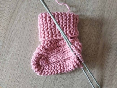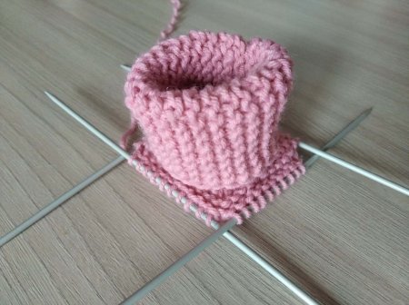 Вяжем далее по кругу еще 2-3 см платочной вязкой. Чтобы она получилась, чередуем ряд лицевых петель и ряд изнаночных.