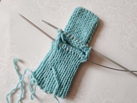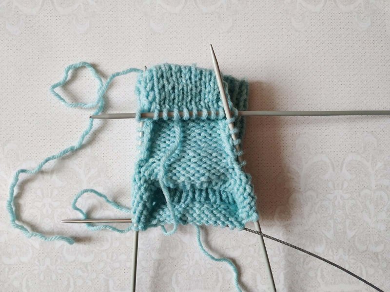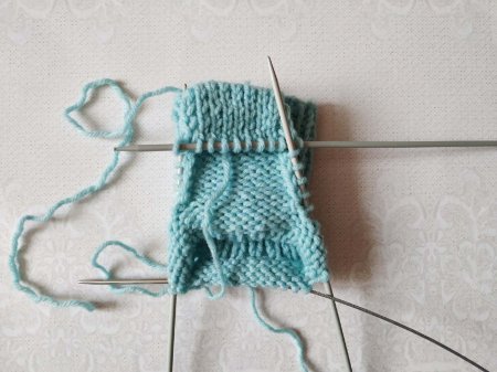 Теперь с обеих сторон верхней части набираем по 9 петель через кромочные. Оставшиеся петли провязываем лицевой гладью. На дополнительной спице оставляем только петли пяточной части.