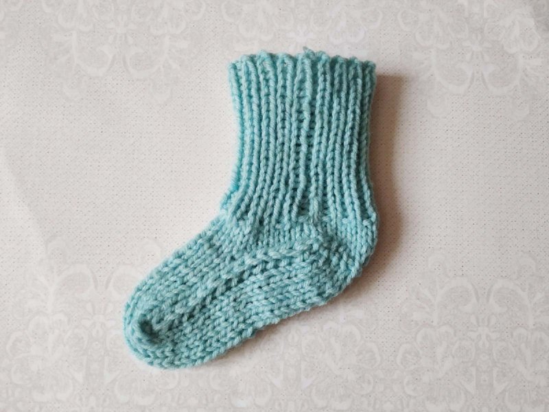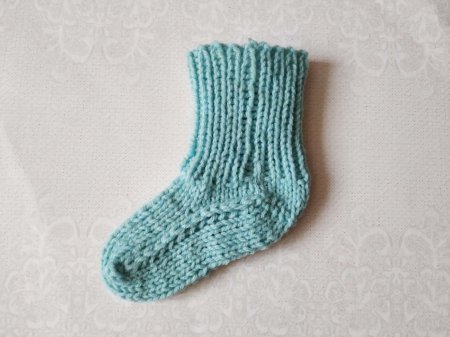 На изнаночную сторону выводим нить и фиксируем ее там. Хвостик прячем между петельками. По такой же схеме вяжем второй носочек.
