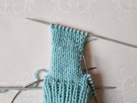 Вяжем по петлям первой спицы разворотными рядами. Провязываем столько рядов, сколько нужно для длины верхней части носочка.