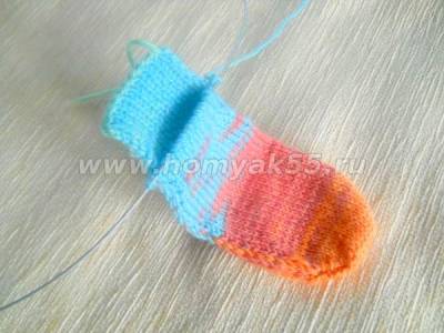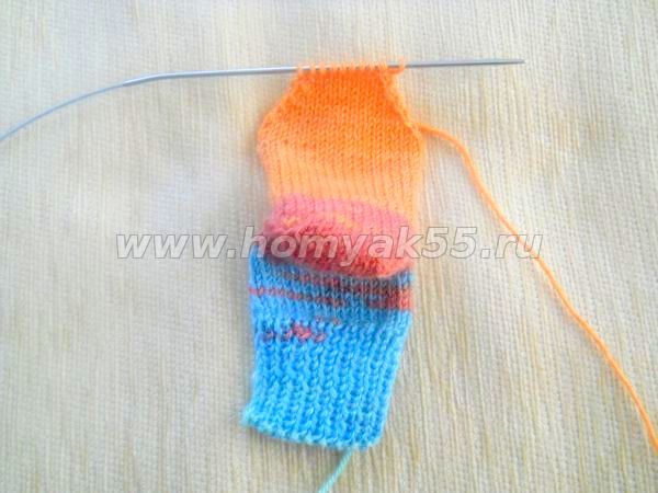 Ту часть носочка, где будут располагаться пальчики, выполняем по тому же принципу, что и пятку. Сначала убавки до 10-ти петель, а после прибавки до 20-ти петель.