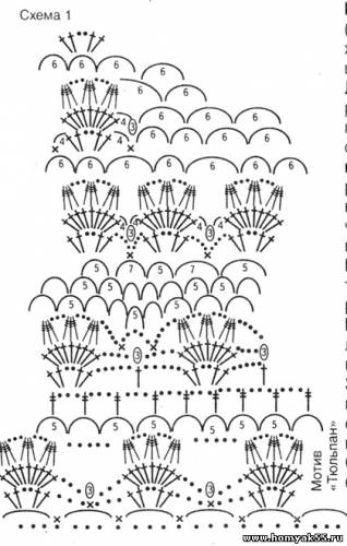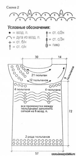 Платье вяжется сверху вниз одной деталью. Первый ряд кокетки состоит из 21 мотива "тюльпан", связанных по схеме 1. Провязав 3 ряда "тюльпанов", распределите их следующим образом: по 9 - на рукав, по 12 - на перед и спинку.Продолжите вязания переда и спинки вкруговую. Выполните 6 полос из "тюльпанов" - по 2 спереди и сзади, по 1 с каждой боковой стороны. Все промежутки между "тюльпанами" заполните сеткой из 6 ВП. Довязав до талии, выполните прибавки по схеме 2. Закончите вязание 2 рядами "тюльпанов" по схеме 1.