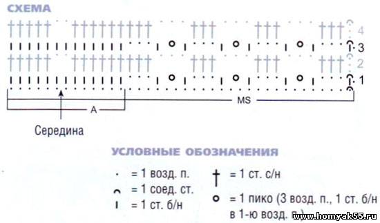 2-й ряд: 2 ВП подъёма, рельефные ССН сзади (1 ССН, вводя крючок сзади вокруг в ССН предыдущего ряда).