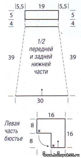 Отметить на верхнем краю нижней части середину переда. На задней половине связать ещё 5 см СБН прямыми и обратными рядами (задняя кокетка). Для правой центральной планки бюстье связать на 5 петлях справа от отметки 15,5 см резинкой. Симметрично связать левую центральную планку бюстье. Выполнить шов частей бюстье (см. соответствующие значки на выкройке). Пришить части бюстье между планками и задней кокеткой, слегка припосаживая ширину. Сшить заднюю кокетку с частями бюстье. Сшить планки бюстье по середине переда на 3 см.