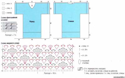 Вам потребуется: 600 г пряжи «SUMMER» (70 % хлопка, 30 % вискозы, 350 м/100 г) голубого цвета (в 2 сложения): крючок № 2,5; спицы № 3.