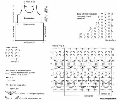 Вязать сверху вниз. Нить прикрепить к краю набора задней детали лифа, затем провязать 3 ВП, 12 (13; 14; 16:17) раппортов В1 и 1 ССН из последней ВП набора, далее вязать узором В по схеме 2 след. образом:размер XS: * 1 раз над тремя раппортами А провязать 1 раппорт В1, затем 2 раза над двумя раппортами А провязать по 1 раппорту В1 *, повторять от * до * 3 раза;