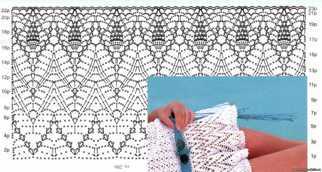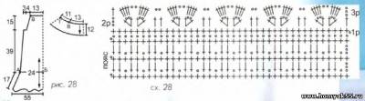 Перед началом работы постройте выкройку деталей изделия в натуральную величину. Выполните образец фонового узора по схеме 28 и с его помощью определите нужное количество петель. Начните работу от линии АБ и вяжите вверх, делая убавки в соответствии с выкройкой.Соедините готовые детали по боковым швам. Далее от линии АБ свяжите пояс (смотрите схему 28), затем оборку по схеме 28 а. Проймы обвяжите одним рядом СБН. Для оборки ворота наберите между точками В цепочки из ВП длиной 22 см. Свяжите оборку, руководствуясь схемой 28, начиная узор с 5-го ряда.