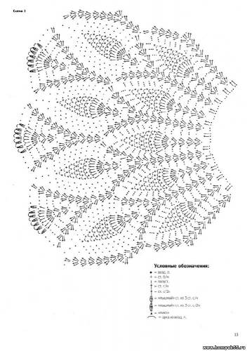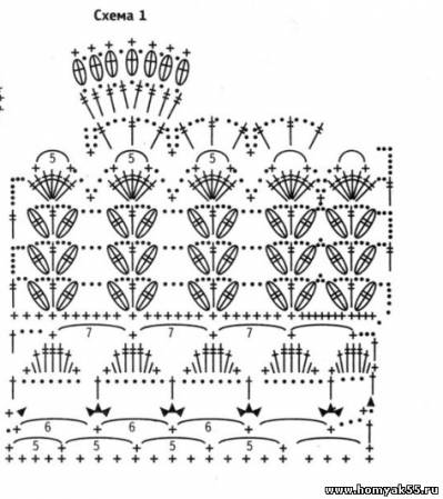 Платье вяжется сверху вниз. Наберите 105 ВП + 3 ВП подъема, вяжите узором по схеме 1. Затем разделите работу следующим образом: по 6 раппортов на каждый рукав, 6 раппортов на спинку и 7 раппортов на перед. Провяжите 1 ряд СБН, выполнив дополнительно по 3 ВП для пройме каждой стороны. Далее вяжите подол платья вкруговую узором по схеме 2 до желаемой длины.