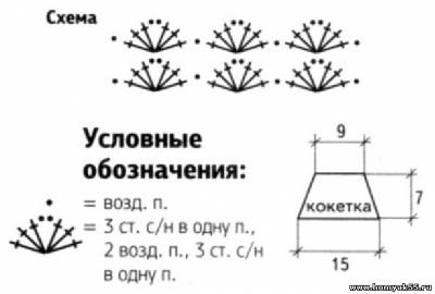 Вяжите ССН, делая убавления в каждом ряду по краям. Симметрично вяжите спинку. Обвяжите кокетку и спинку "пико". Скрутите 4 шнурка и пришейте их, как показано на фото.Журнал "Копилка вязаных идей для детей", 2012