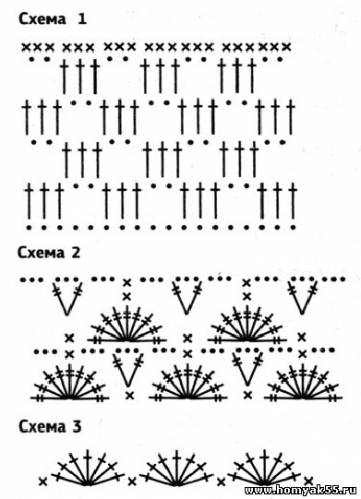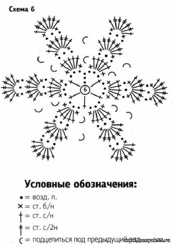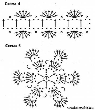 Нижний край подола обвяжите фиолетовой нитью "пико". Верхний край кокетки обвяжите каймой по схеме 3. По схеме 4 свяжите 2 бретели желаемой длины и пришейте их к кокетке. Свяжите 3 белых и 1 фиолетовый цветок по схеме 5 и ещё 2 фиолетовых цветка по схеме 6. Пришейте цветочки к кокетке, как показано на фото.$CUT$