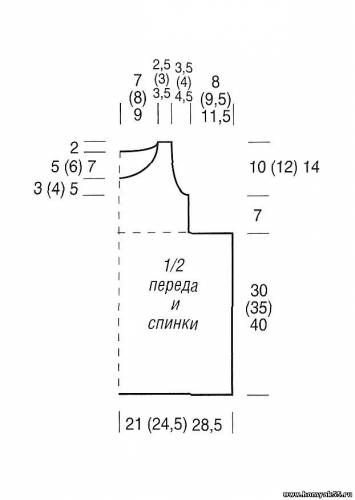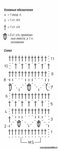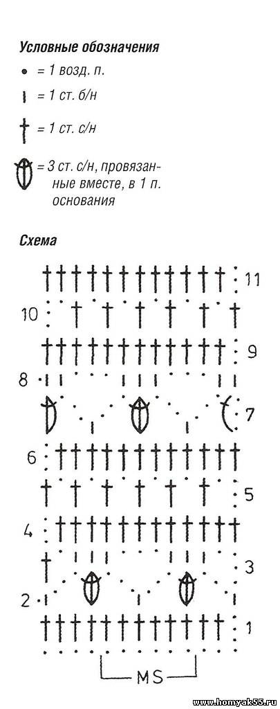 Кружевной узор: вязать по схеме. Начинать с петель перед раппортом, повторять петли раппорта, заканчивать петлями после раппорта. Выполнить 1 раз с 1-го по 11-й ряды, затем повторять со 2-го по 11-й ряды.