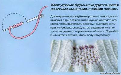 Вертикальные линии для разметки буф - это рубчики, образованные рельефными столбиками с двумя накидами. Они попарно соединяются двумя горизонтальными стежками. Буфы получаются упругими, если работать одновременно с двумя горизонтальными рядами, располагая между ними по диагонали. Для закрепления складок выполнить дополнительный ряд буф по линии горловины.Как сделать буфы