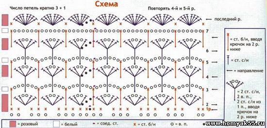 Для юбки нитью розового цвета поднять петли с другой стороны начальной цепочки, наложив 3 петли правой полочки спинки на левую, и вязать по кругу узором по схеме, формируя 32 раппорта. Через 23 см, выполнив последний ряд, указанный на схеме, закончить вязание.