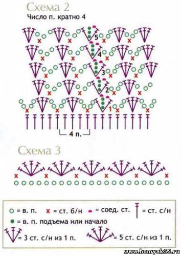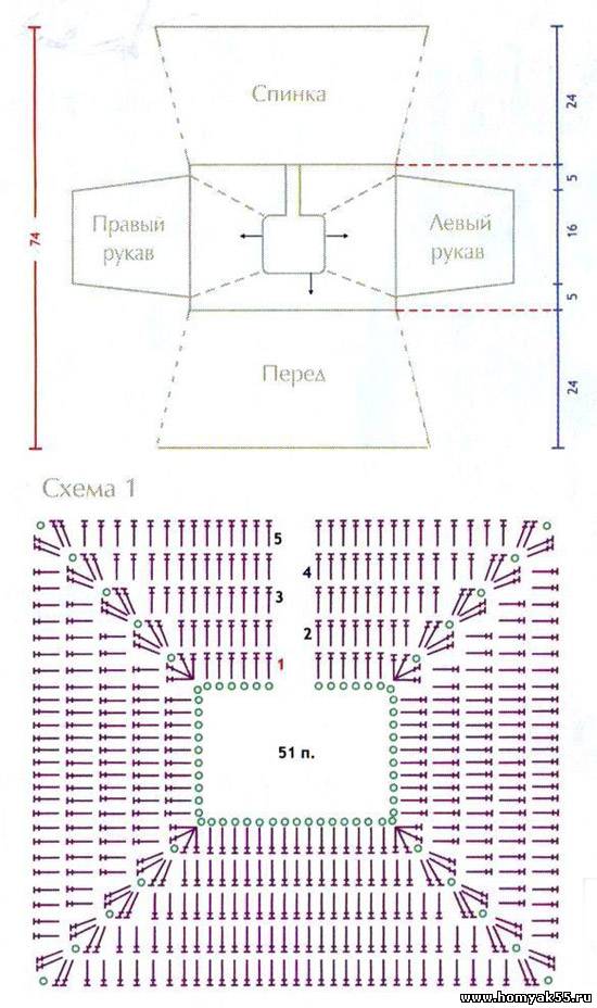 Вязать одной деталью, начиная от выреза горловины. Набрать цепочку из 51 ВП и вязать кокетку по схеме 1 до 11-го ряда = 227 петель.$CUT$ Разделить петли след. образом: 56 петель спинки, по 54 петли каждого рукава и 59 петель переда, не включая ВП линий реглана. Объединить петли спинки с петлями переда и вязать 2 круговых ряда ССН, прибавив в 1-м ряду 1 петлю. = 116 петель, начиная каждый ряд с 3 ВП подъема и замыкая СС.Для юбки продолжить вязать узором по схеме 2. На общей высоте 37 см закончить вязание. Возобновить вязание рукавов ССН круговыми рядами, убавив в каждом 2-м ряду 11 раз по 2 петли = 32 петли. На высоте 23 см от кокетки закончить вязание.