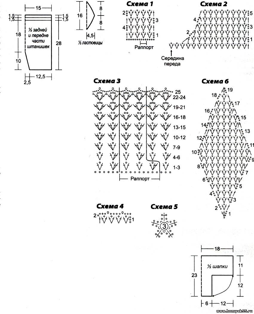 Вшейте ластовицу. Выполните швы. По низу штанишек розовой пряжей выполните обвязку по схеме 4. Пояс отверните на изнаночную сторону и подшейте. Вденьте тесьму-резинку.Шапочка