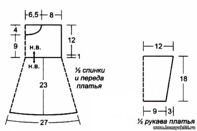 Выполните плечевые швы. Вшейте рукава. Выполните боковые швы и швы рукавов. По низу кокетки вяжите юбку.Юбка