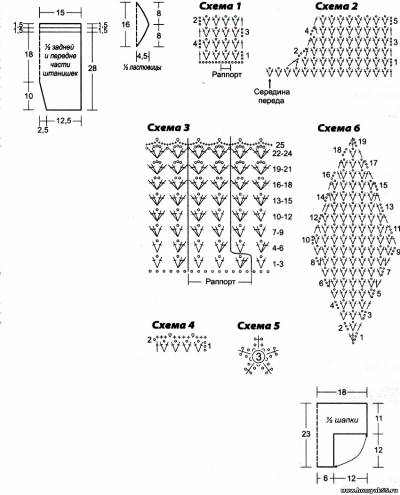 Для левой штанины основной пряжей свяжите цепочку из 39 ВП + 3 ВП подъема и на ее основе вяжите узор по схеме 1 (= 12,5 раппортов). Для расширения прибавьте с левой (внутренней) стороны в каждом 2-м ряду 5 раз по 1/2 раппорта. Провязав 12 рядов от начала работы, отложите вязание. Правую штанину свяжите зеркально левой. Затем соедините обе детали и вяжите одними полотном. Провязав 34 ряда от начала вязания штанин, для пояса свяжите 1 ряд СБН, 2 ряда ССН, 1 ряд СБН и закончите работу.Передняя деталь