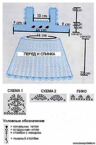Пришить бретели к спинке, оставив свободными 4 см для пройм. Обвязать бретели по внешнему краю фантазийным узором по схеме 2. Внутренний край бретелей, вырез горловины и боковые части обвязать 1 рядом пико. Продеть через низ кокетки ленточку и пришить на кокетку цветочки. Пришить на одну из половинок спинки 2 небольшие пуговицы, а на другой связать петельки для застежки.