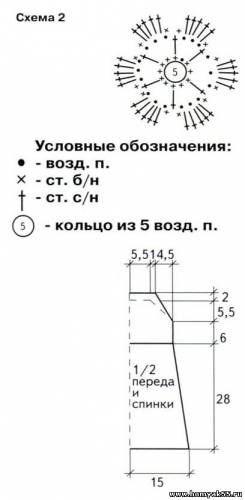 Обвяжите нижний край подола СБН салатовой нитью. Грудку, спинку и проймы обвяжите белой нитью 1-м рядом СБН и 1 рядом СБН с «пико». Свяжите 4 завязки: наберите цепочку из ВП желаемой длины и провяжите 1 ряд СБН. Пришейте завязки к уголкам грудки и спинки. Свяжите 3 цветочка по схеме 2 и пришейте их на кокетку, как показано на фото.