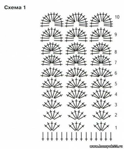 Вяжите от наборного края кокетки вниз ажурным узором по схеме 1: провяжите 1 раз 1-й ряд, 3 раза 2-й ряд, 1 раз 3-й ряд, 3 раза 4-й ряд, 4 раза 5-й ряд, 4 раза 6-й ряд, 5 раз 7-й ряд, 2 раза 8-й ряд и по 1 разу 9-й и 10-й ряды. При этом последние 10 рядов вяжите, чередуя белую и салатовую полоски.