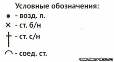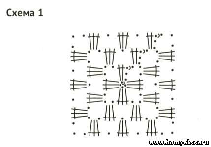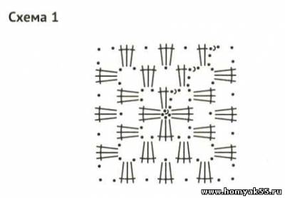 Квадрат: наберите 4 ВП пряжей малинового цвета, замкните в кольцо. Далее вяжите по схеме 1, чередуя в каждом ряду цвета (малиновый - белый - малиновый).