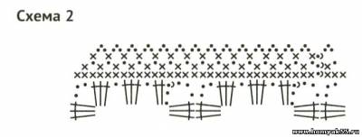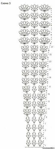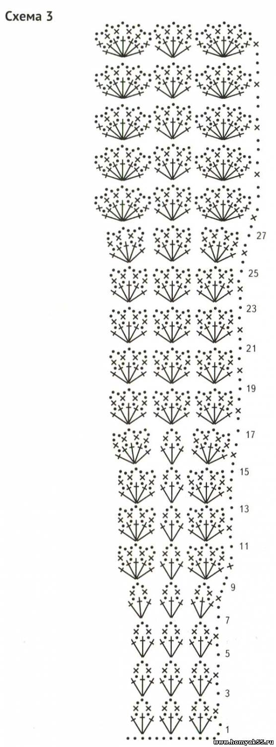 Обвяжите по кругу нижнюю часть квадратов пряжей белого цвета СБН, затем вяжите по схеме 2. Далее вяжите по схеме 3, чередуя цветные полосы: 5 рядов - малинового, 1 ряд - белого, 5 рядов - малинового, 1 ряд - белого, 4 ряда - малинового и 1 ряд белого цветов.