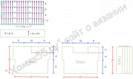 Для образования складок юбки * отсчитать 6 рядов и заложить полотно внутрь, отсчитать след. 4 ряда и выполнить сгиб в обратном направлении *, повторять от * до * до тех пор, пока не будут заложены все складки. Для закрепления складок обвязать верхний край 1 рядом СБН.Выполнить плечевые и боковые швы спинки и переда, пришить их к юбке. Обвязать подол юбки, вырез горловины и проймы нитью черного цвета 1 рядом СБН. Для шлевок из нити белого цвета набрать цепочку из 4 ВП и вязать ССН. На высоте 3 см закончить вязание.