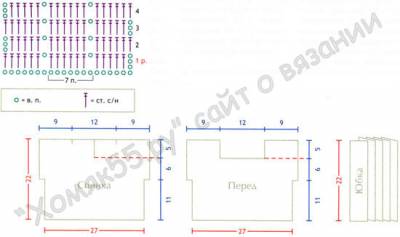Набрать цепочку из 69 ВП и вязать узором по схеме. На высоте 11 см прибавить с обеих сторон для рукавов по 3 петли = 75 петель и вязать прямо.$CUT$ На высоте 6 см от начала рукавов для разреза закрыть среднюю 1 петлю и вязать обе стороны отдельно. На общей высоте 22 см, получив по 23 петли для каждого плеча с рукавом и по 14 петель для выреза горловины, закончить вязание.Перед