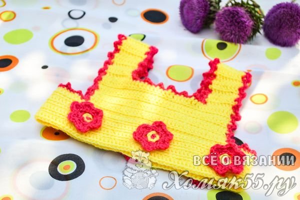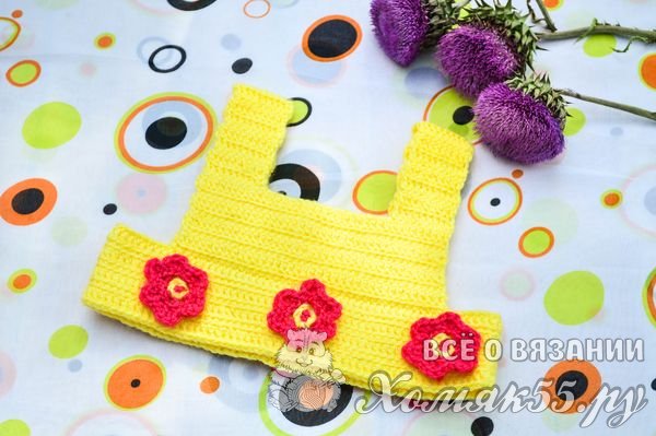 Нижний край кокетки обрабатываем желтой пряжей тем же узором, что мы раньше обрабатывали горловину (3 столбика без накида, 3 воздушных петли).