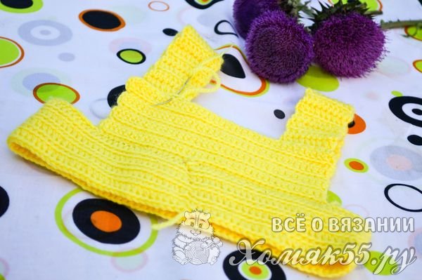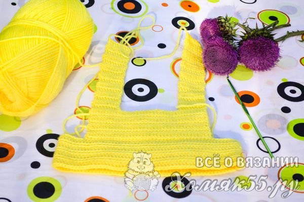 Теперь можно вязать лямки. Для этого отсчитываем с двух сторон по 10 петель и вяжем лямки столбиками с накидами 15 рядов. Вяжем с задней части кокетки.