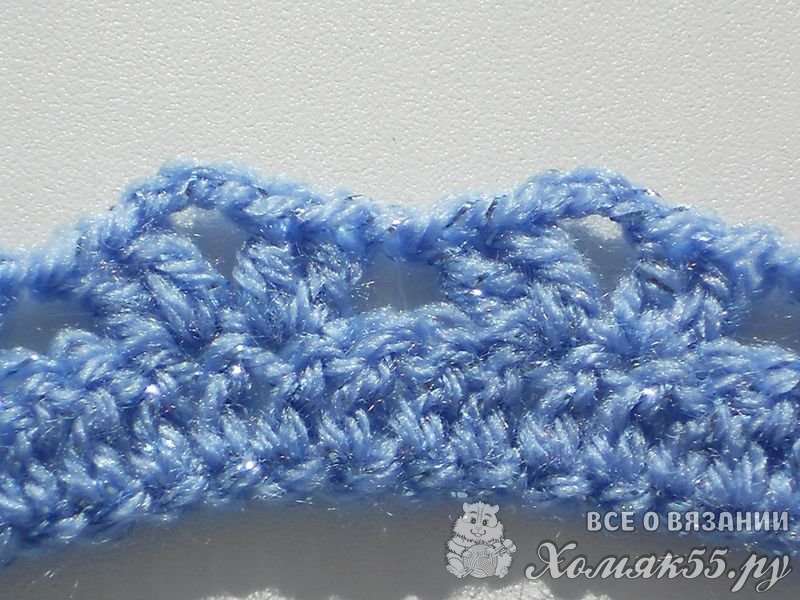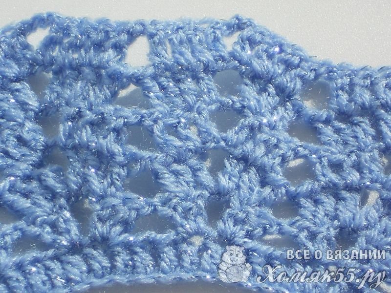 Второй ряд вяжем согласно следующей схеме: * 2 столбика с накидом в одну петлю предыдущего ряда, 3 воздушных петли, 2 столбика с накидом в одну петлю предыдущего ряда, пропускаем три петли *. Узор повторяем от * до *.