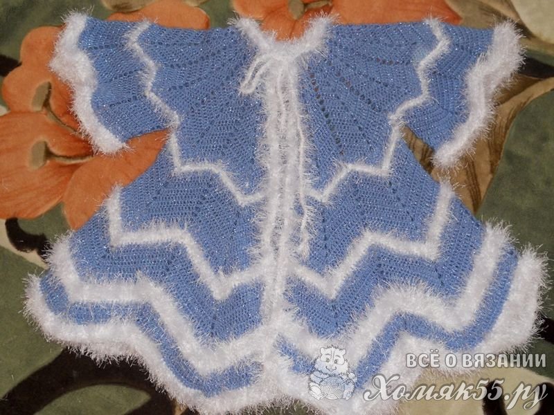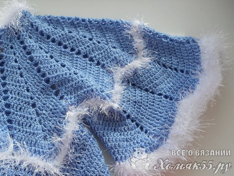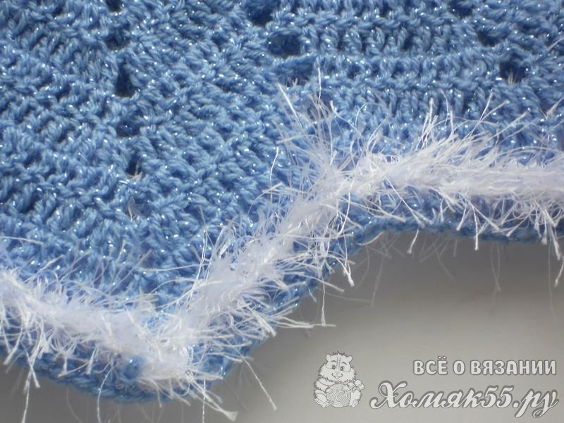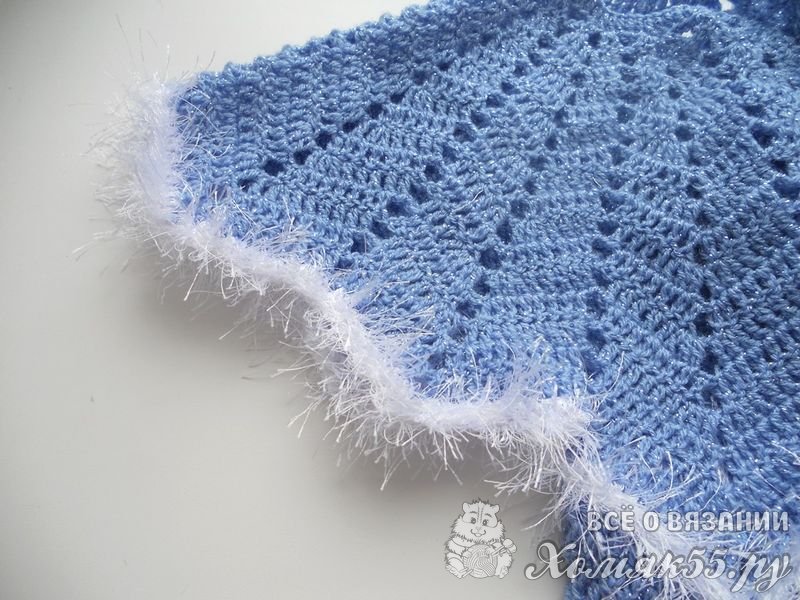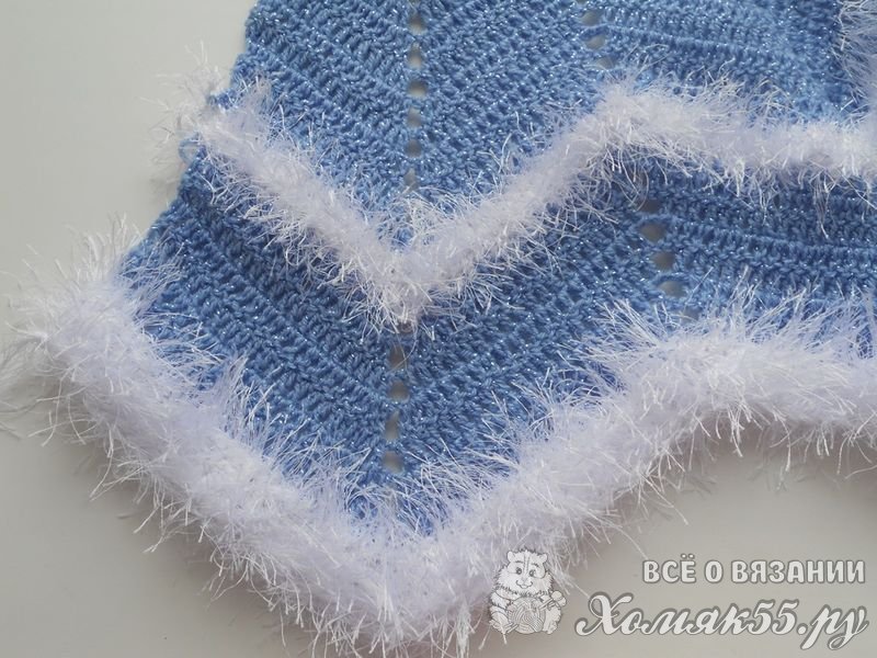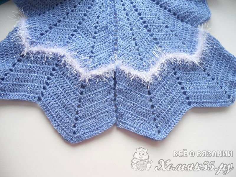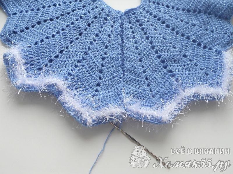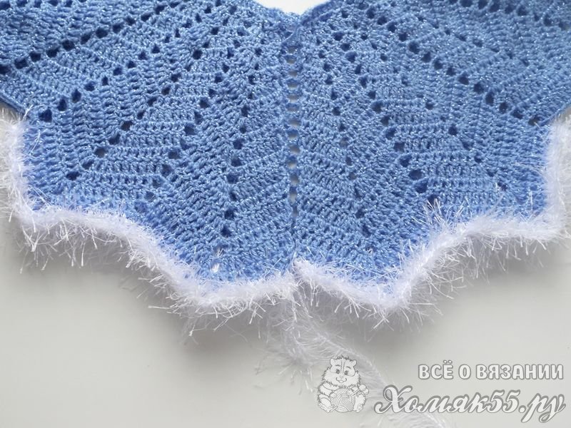 Продлить длину подола можно добавив еще 4 ряда голубой нити и 4 ряда белой. На этих рядах я закончила вязание.