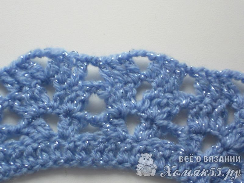 5-6 ряд: * 4 столбика с накидом в одну петлю предыдущего ряда, 3 воздушных петли, 4 столбика с накидом в одну петлю предыдущего ряда, пропускаем три петли *. Узор повторяем от * до *. Таким образом, с каждым третьим рядом мы увеличиваем количество столбиков в арке.