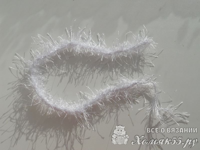 Осталось обвязать горловину с полочками и прикрепить шнурок. Наберите белой «травкой» цепочку из 30 воздушных петель.
