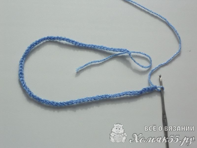 - Пряжа 100% акрил с добавлением люрекса голубого цвета (100гр/400м) – 2-3 мотка (в зависимости от желаемой длины)
