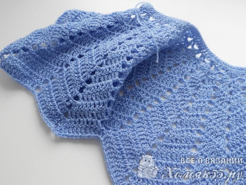 Проденьте сквозь горловину. Не забудьте двумя рядами обвязать полочки.