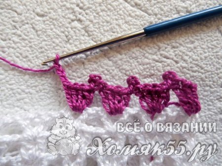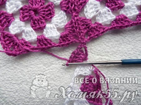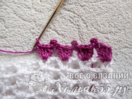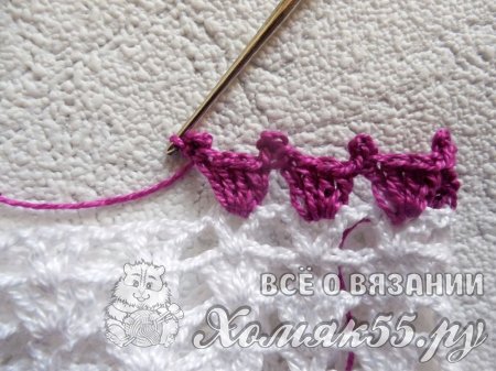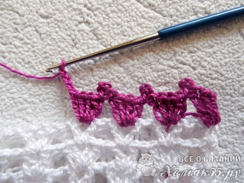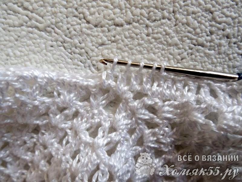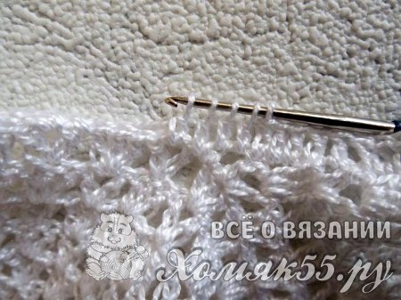 Обратите внимание: провязывая веера на соединяющей цепочке , пропускайте между ними две воздушные петли.