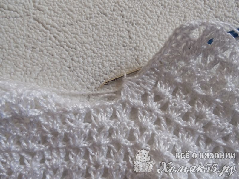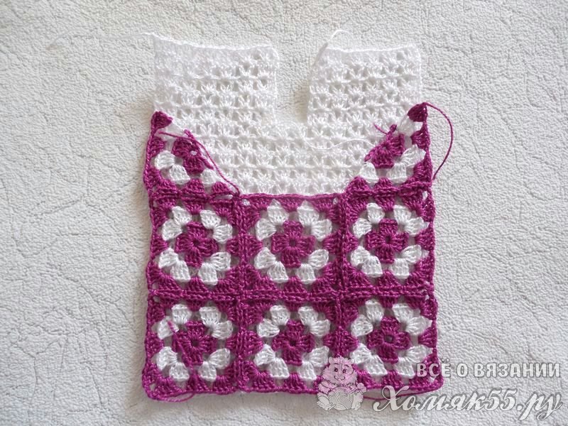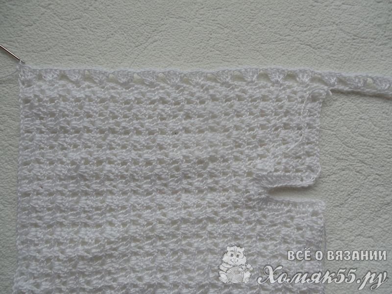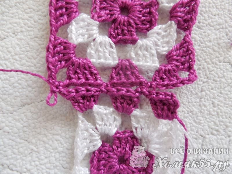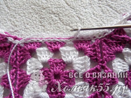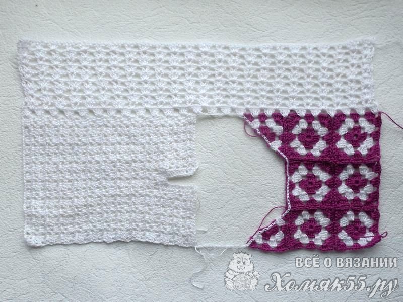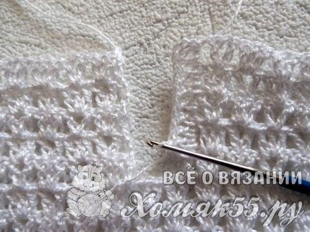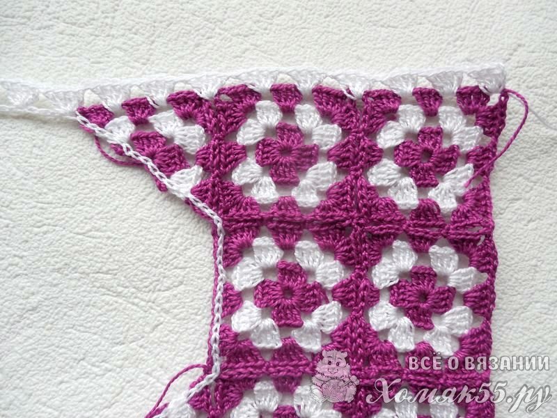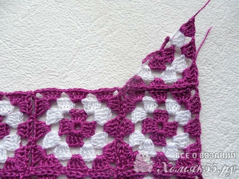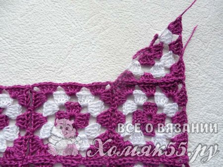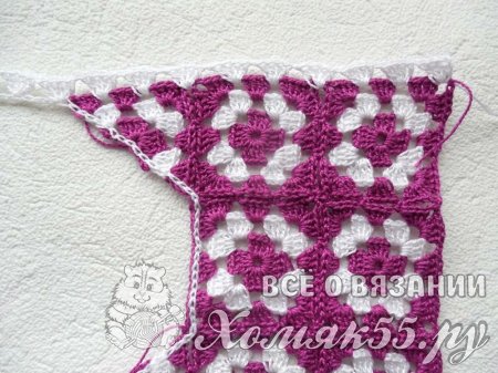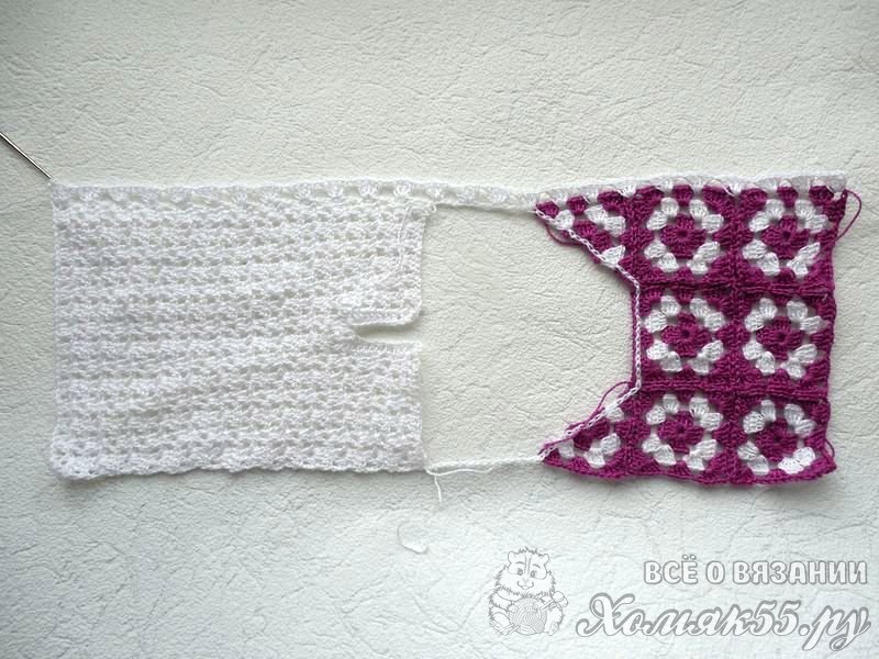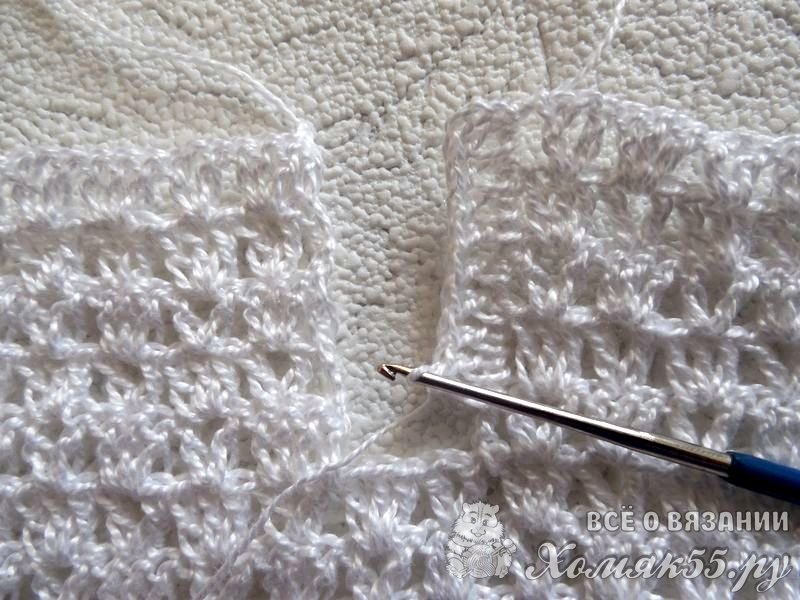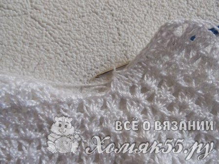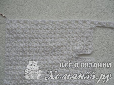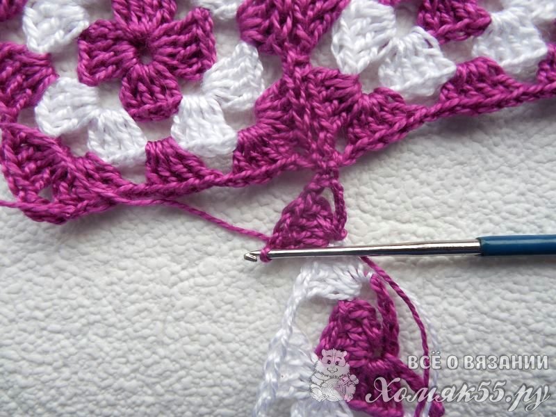 Теперь можно приступать к довязыванию ширины кокетки и рукавов. Для этого привяжите белую нить к нижнему углу, ориентируясь на схему направлений вязания, вяжите «веера» из четырех столбиков с накидом.