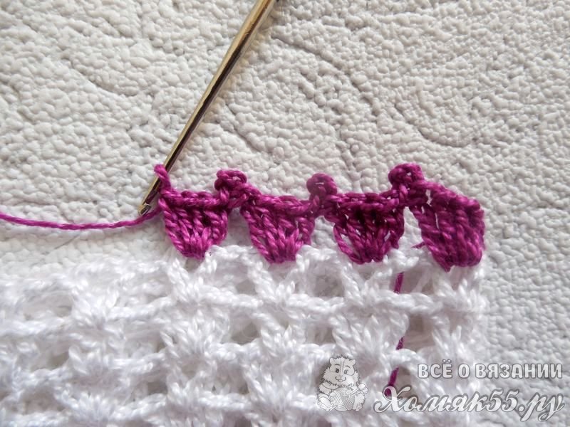 Провяжите шесть рядов рукава, как показано на схеме. Обратите внимание на то, что шестой ряд вяжется не как основное полотно. Обвяжите край рукава, как показано на схеме, нитками цвета фуксия. Выполнение элемента «пико» показано на фото ниже.
