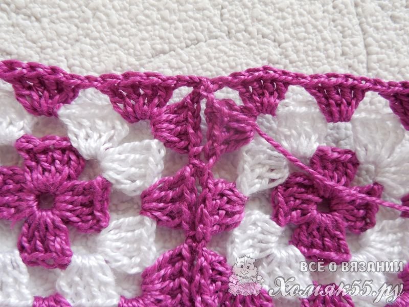 Обратите внимание, что только первый мотив провязывается сразу и полностью. Все остальные мотивы в процессе вязания последнего, третьего, ряда нужно соединять между собой.