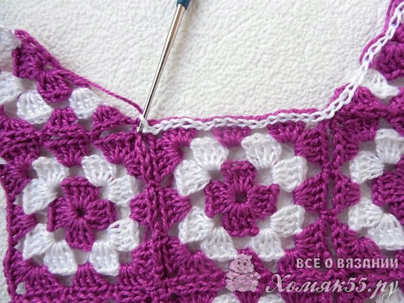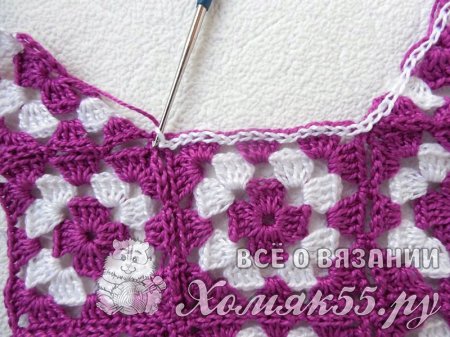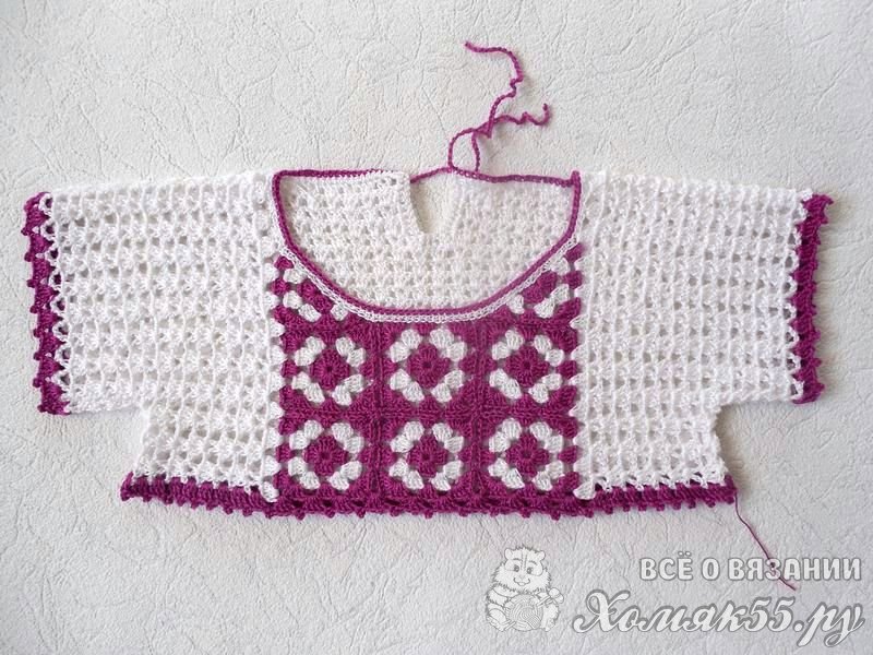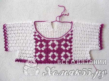 Если не хотите делать завязки, можно сделать пуговицу и петлю. Для этого приготовьте пуговицу и наберите нитками цвета фуксии цепочку из 5-6 воздушных петель, замкните в кольцо и дальше обвязывайте горловину. Пуговицу просто пришейте. Когда горловина обвязана, сшейте боковые швы и обвяжите низ кокетки аналогично тому, как Вы обвязывали края рукавов.