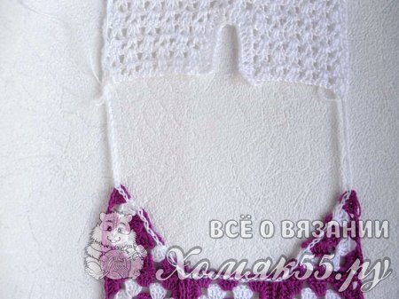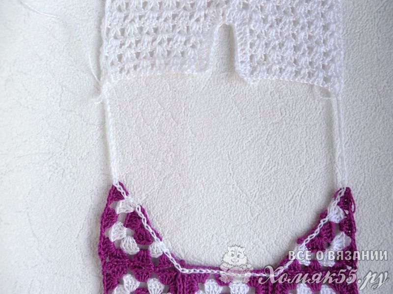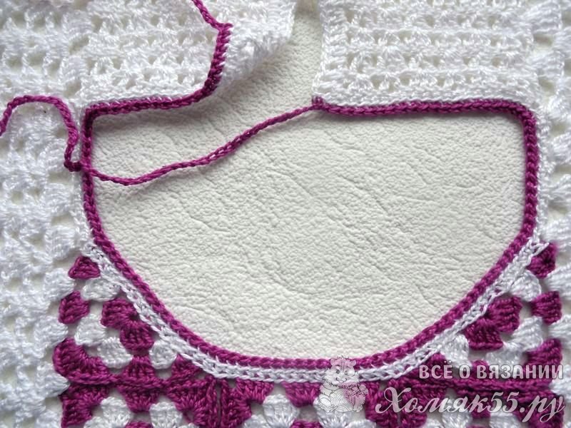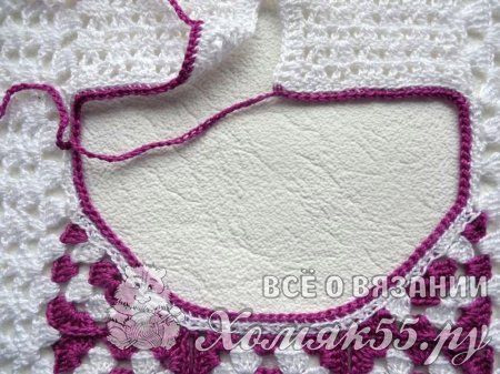 Теперь определитесь с тем, как будет закрываться щель на горловине спинки, застежкой на пуговке или завязками, как в данном мастер-классе. Если Вы решили делать завязки, то наберите нитками цвета фуксия цепочку из 20-25 воздушных петель, затем начинайте обвязывать горловину столбиками без накида, оставляя этот кусочек цепочки висеть. Довязав до другого края горловины, также провяжите цепочку из 20-25 воздушных петель. Завязки готовы.